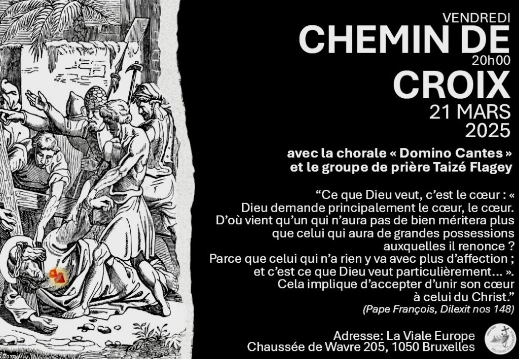 W czasie Wielkiego Postu w 2025 r. chór Domino Cantes został zaproszony do zapewnienia oprawy muzycznej dwóm nabożeństwom Drogi Krzyżowej – 13 marca 2025 r. w kościele p.w. Matki Boskiej La Cambre w dawnym Opactwie Cysterek (zgromadzenie przetrwało do Rewolucji Francuskiej; gotycki kościół (w którym przywrócono kult religijny w 1920 r.) i krużganki z XIV wieku stanowią najbardziej kompletny średniowieczny zabytek religijny w regionie brukselskim) oraz – jak od wielu już lat – 21 marca w La Viale Europe (Aleja Europa) przy w kościele p.w. Najświętszego Sakramentu.