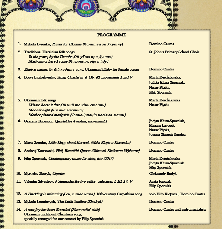 Program półtoragodzinnego koncertu (do obejrzenia w całości tutaj) był bardzo różnorodny i jednocześnie niezwykle wzruszający. Złożyły się na niego zarówno utwory wokalne, jak i instrumentalne, kompozytorów ukraińskich oraz polskich (zob. załączony plakat). Oprócz instrumentalistów, w koncercie wziął udział dziecięcy chór z St John’s International Primary School.